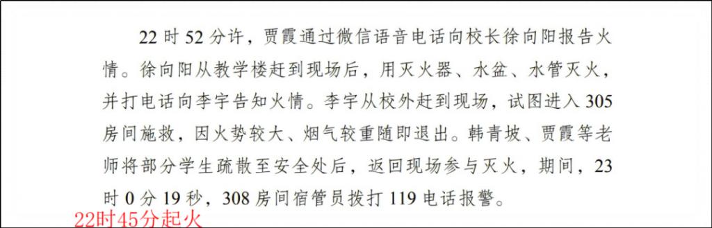 第一个灭火的人是接贾霞电话的校长,他灭火时,已是起火 7 分钟后了。
