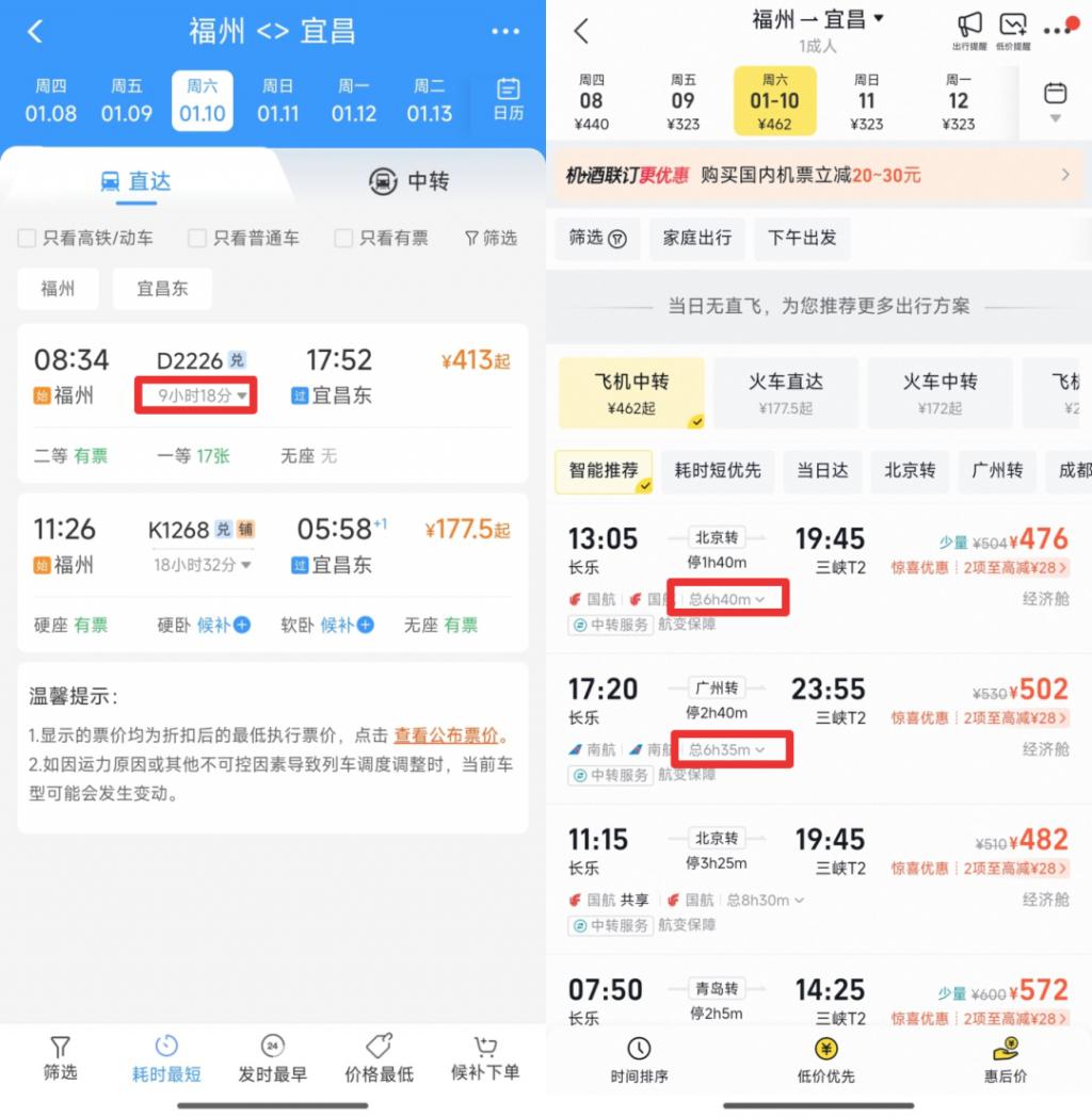 张水华参加了 11 月 2 日 ( 周日 ) 的宜昌马拉松,过往日期的交通方案不好查,我们就看了个近日福州宜昌往返,周六去周日归的交通方案 :1 月 10 日 ( 周六 ) 从福州到宜昌,高铁直达需耗时近 9 小时 ; 若选择搭乘飞机,则必须中转,纯算坐飞机和中转等待的时间,最快也要近 7 小时。