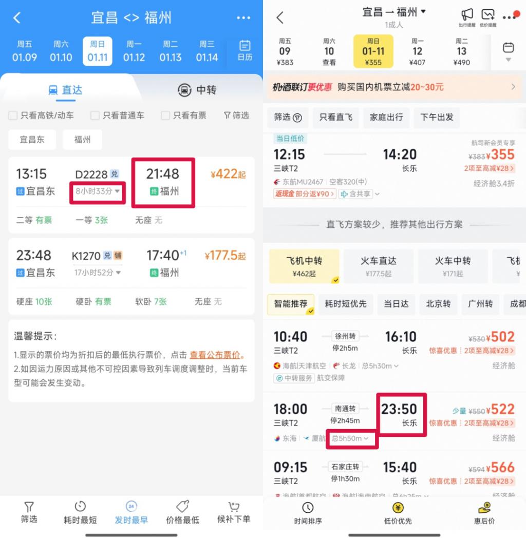 火车方案是 21:48 到,中转航班方案是 23:50 分到。