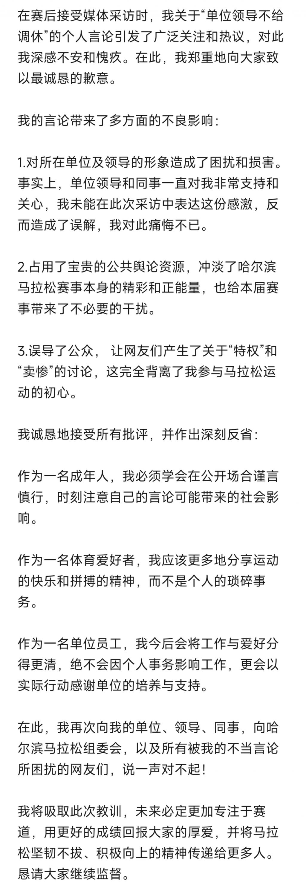 哎,不仅向 " 向我的单位、领导、同事,向哈尔滨马拉松组委会 " 道歉,还向 " 被我的不当言论所困扰的网友们 " 说了一声对不起。