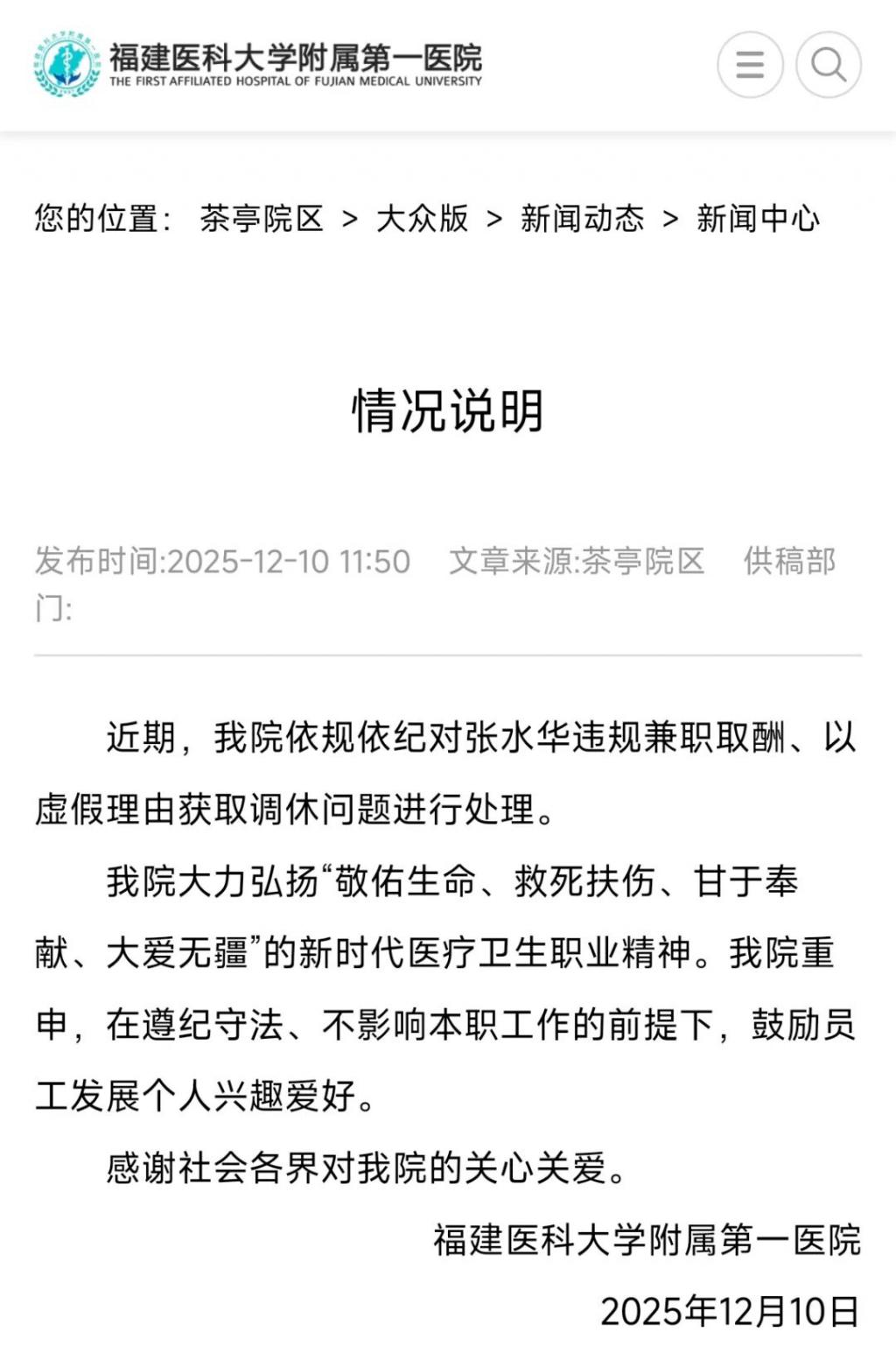 12 月 9 日,《福建医科大学附属第一医院关于对张水华的处理决定》曝光。
