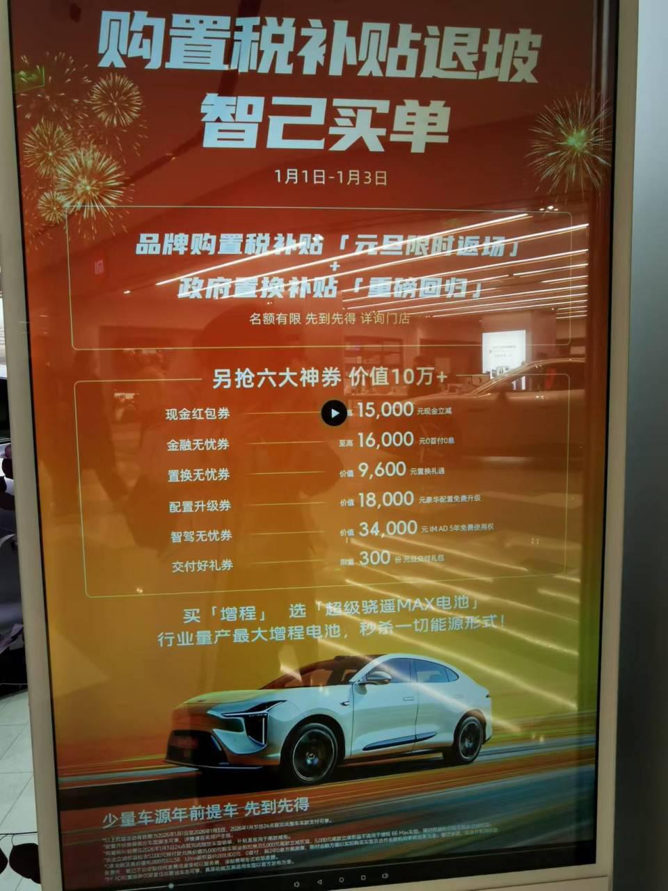 记者在智己汽车销售门店也看到了有着 " 购置税补贴退坡,智己买单 " 字样的宣传标语。根据展示内容,购车者如果参与品牌购置税补贴活动,需在 2026 年 1 月 3 日 24 点前完成指定车型锁单,补贴直接用于尾款减免。