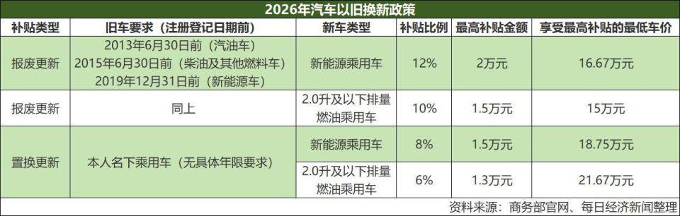 2025 年 12 月 30 日,商务部、国家发展改革委等 8 部门办公厅发布关于印发《2026 年汽车以旧换新补贴实施细则》(以下简称《细则》)的通知明确。与此前政策相比,补贴方式出现了变化,新政策在全国范围内执行统一标准,将定额补贴调整为按车价比例进行补贴,汽车补贴上限则保持不变。其中,汽车报废更新补贴金额不超 2 万元,汽车置换更新最高补贴不超 1.3 万元。