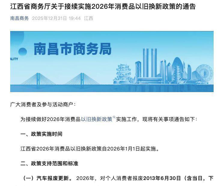 2025 年 12 月 31 日,江西省商务厅发布的《关于接续实施 2026 年消费品以旧换新政策的通告》明确,江西省 2026 年消费品以旧换新政策自 2026 年 1 月 1 日起实施。