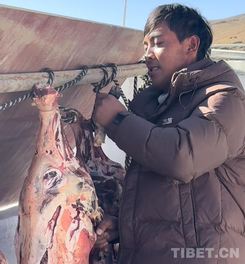 在定日县长所乡古荣村,村民罗布正在新房前晾晒风干羊肉。" 这将是我们在新家过的第一个年," 他说," 希望一年比一年好。" 风干羊肉的香气在冬日的空气中飘散,炊烟从崭新的屋顶升起,处处洋溢着即将到来的日喀则农事新年的味道。