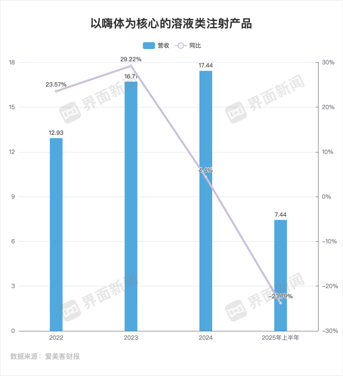 2022年至2024年,以嗨体为核心的溶液类注射产品分别营收为12.93亿元、16.71亿元、17.44亿元,同比增长23.57%、29.22%和4.40%。到了2025年上半年,嗨体为核心的溶液类注射产品营收为7.44亿元,同比下降23.79%。