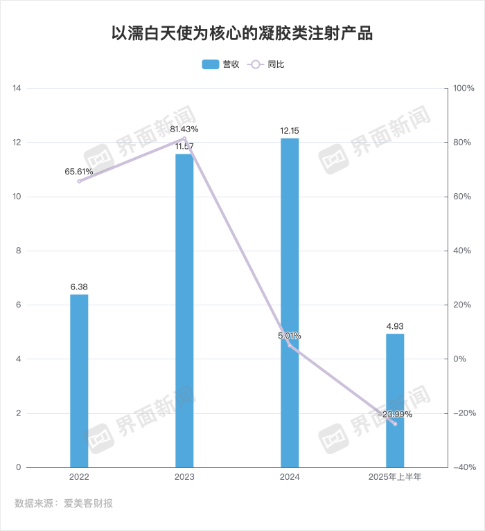 2022年至2024年,以濡白天使为核心的凝胶类注射产品分别营收为6.38亿元、11.57亿元、12.15亿元,同比增长65.61%、81.43%和5.01%。到了2025年上半年,濡白天使为核心的溶液类注射产品营收为4.93亿元,同比下降23.99%。