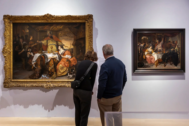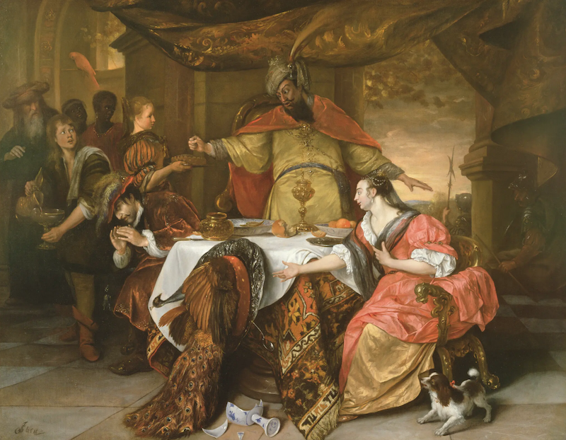 荷兰绘画大家扬·斯汀(Jan Steen)绘制了三个版本的以斯帖的盛宴。几十年来,这三个版本首次在这一主题的展示中出现。在画作中,以斯帖置于杂乱的背景中,让人感觉不像圣经中的时刻,反而有点像电视剧《我爱露西》(I Love Lucy)里,的场景。在画作《亚哈随鲁之怒》(The Wrath of Ahasuerus,1670年)中国王怒目圆睁,从椅子上站起来大声呵斥哈曼,导致菜肴飞溅。这里描绘的是一顿晚餐,摆放在华丽银盘中的食物上缀满了孔雀羽毛,正从半空中滑向地面。这是最荷兰式的场景,碎瓷片在地板上闪闪发光,长耳猎犬在前方叫个不停。