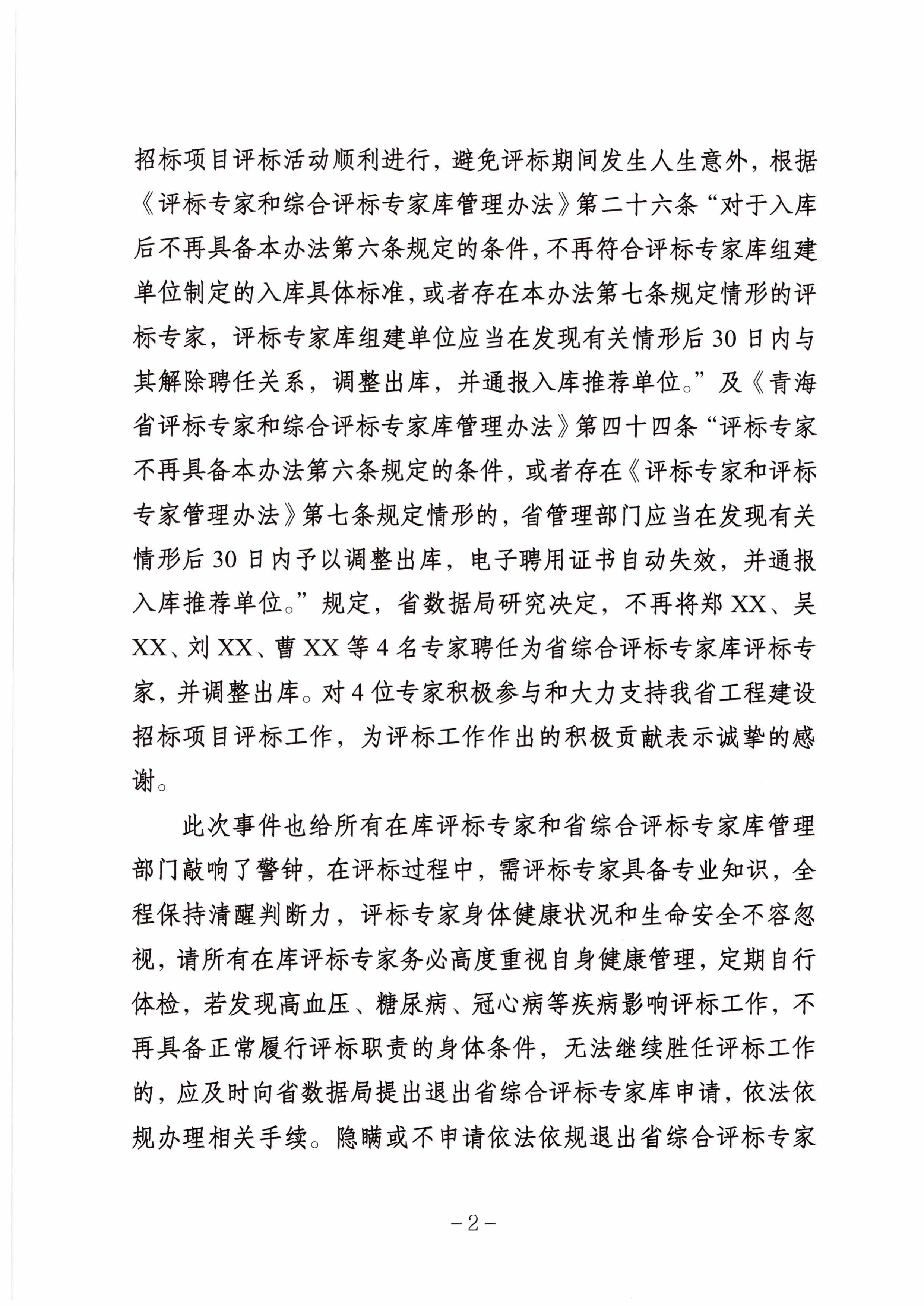 通报表示,评标工作责任重、强度高,评标时长不确定,时常需加班加点延时评标,甚至隔夜评标,对评标专家身体健康状况要求较高专家身体健康是确保评标活动顺利进行和评标质量的根本保证。本着对评标专家个人身体健康和生命安全负责,保障每一个招标项目评标活动顺利进行,避免评标期间发生人身意外,青海省数据局研究决定,不再将该4名专家聘任为省综合评标专家库评标专家,并调整出库。