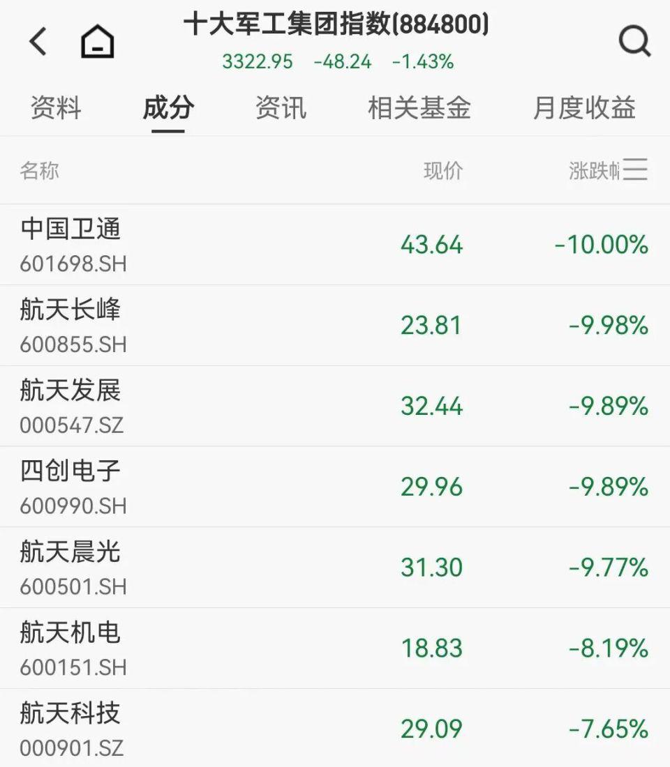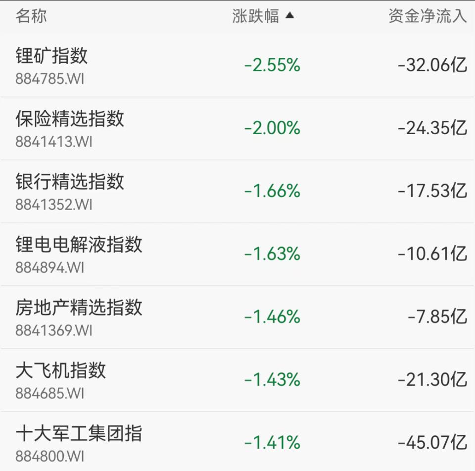 锂矿股、保险股跌幅居前,中矿资源跌 7%,天齐锂业跌 4%,商业航天、军工板块继续重挫回调,中国卫通、航天长峰、航天发展等多股跌停。