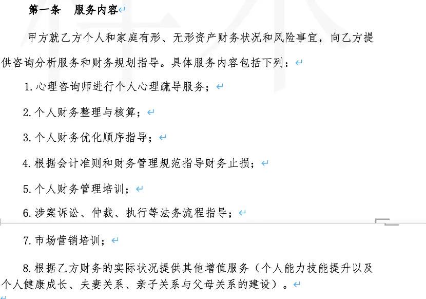 第一财经从中介处获得的一份服务合同中,并未直接写明提供 " 债务优化 " 或 " 征信修复 ",而是罗列了心理咨询、个人财务整理与核算、财务优化指导、市场营销等多项内容。