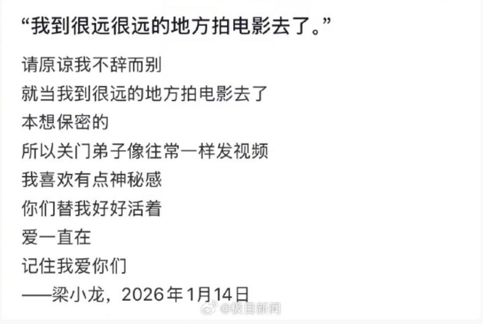 1 月 18 日晚,梁小龙社媒账号发布告别信:请原谅我不辞而别,就当我到很远的地方拍电影去了,本想保密的,所以关门弟子像往常一样发视频,我喜欢有点神秘感,你们替我好好活着,爱一直在,记住我爱你们——梁小龙,2026 年 1 月 14 日。