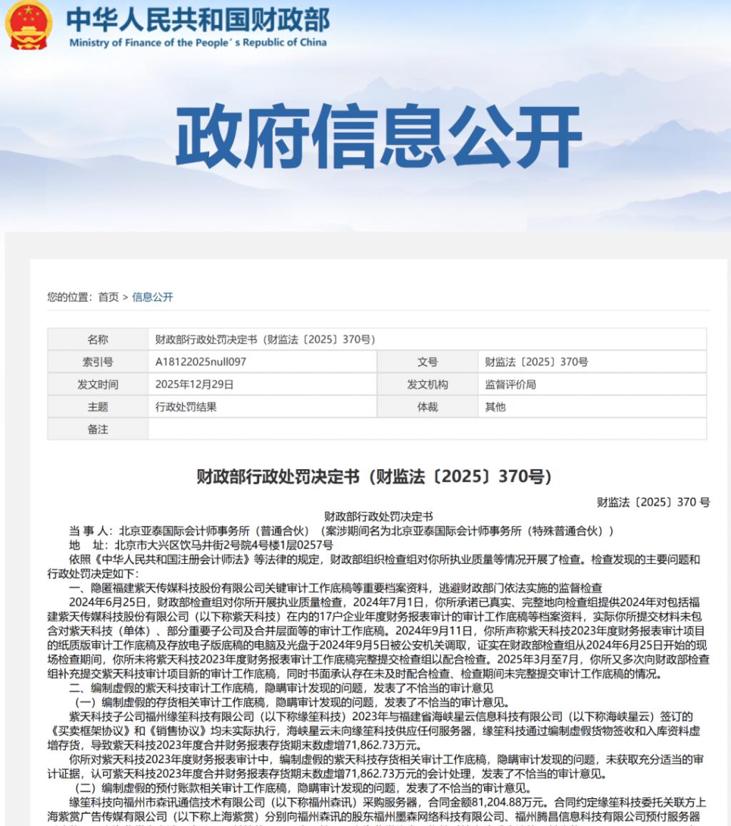 1 月 15 日,财政部公布对北京亚泰国际会计师事务所的行政处罚决定。该所隐匿已退市的福建紫天传媒科技股份有限公司关键审计工作底稿,逃避监督检查。亚泰国际在审计中知悉紫天科技虚增超 15 亿元账目却 " 开绿灯 ",还隐瞒审计问题。财政部对其采取顶格财产处罚和 " 暂停经营业务 1 年 " 资格处罚,两名涉案注册会计师也受相应处罚,体现执法部门对违法行为的零容忍。