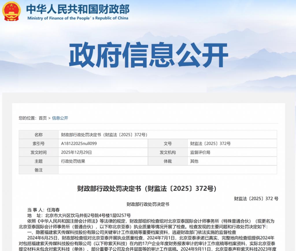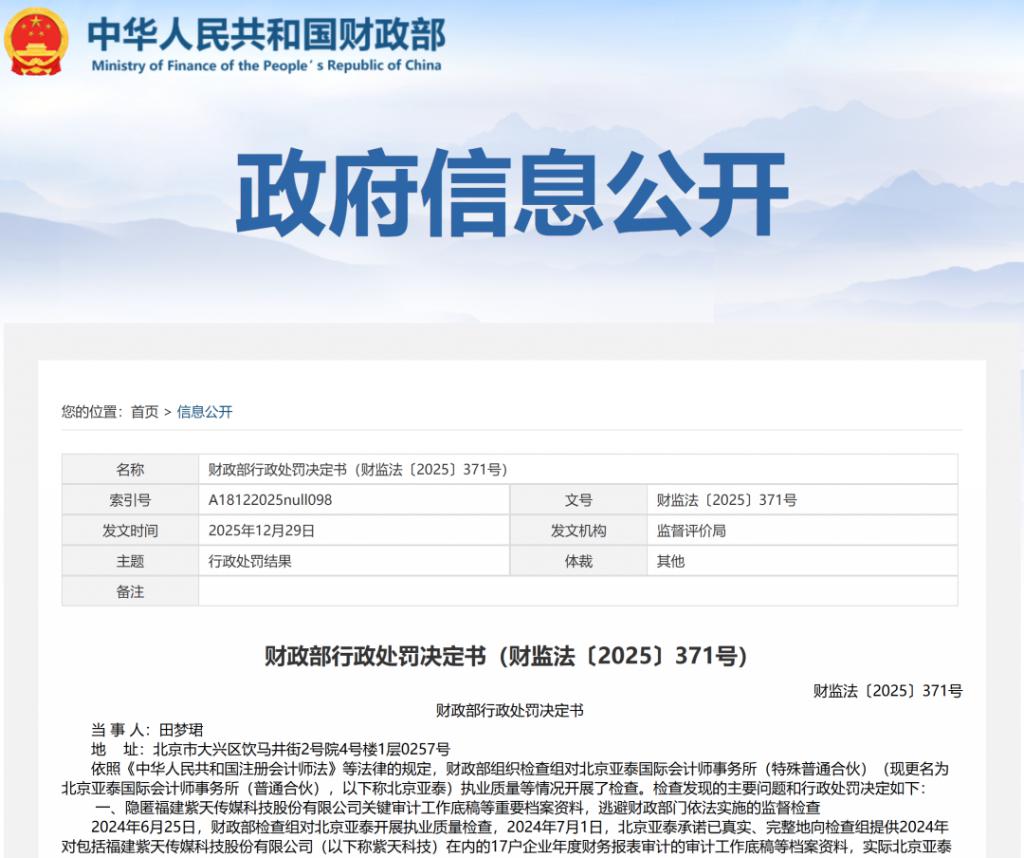 1 月 15 日,财政部公布一则行政处罚决定。北京亚泰国际会计师事务所(普通合伙)(以下简称 " 亚泰国际 ")隐匿福建紫天传媒科技股份有限公司(以下简称 " 紫天科技(SZ300280,已退市)")关键审计工作底稿等重要档案资料,逃避财政部门依法实施的监督检查。
