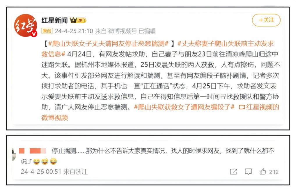这不是一般寻人,考虑到已婚妻子和一个男士爬山,然后失踪一天多,大家就会浮想联翩。