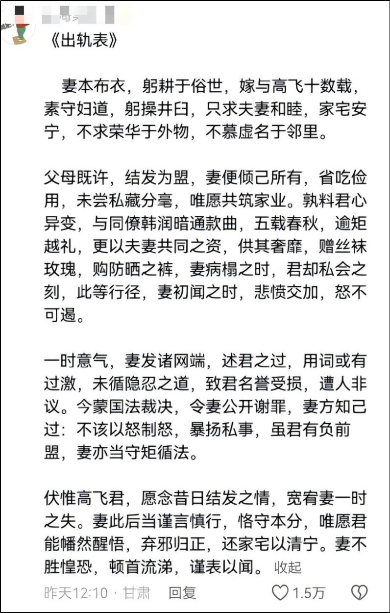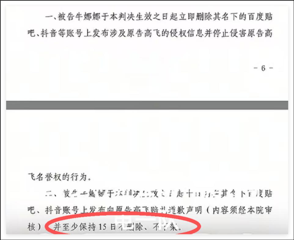 而让她不断公开道歉,是因为她曾在百度贴吧和抖音发布了侵权内容,高某告了她,法院判她连续 15 日道歉,不能删除。