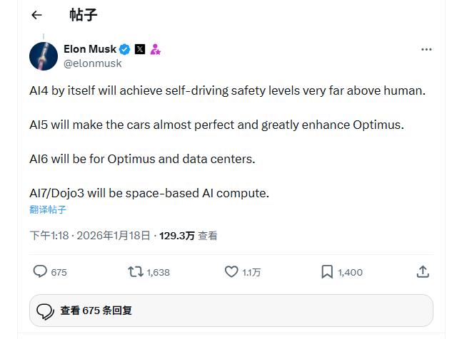 在最新帖子中,马斯克写道:"AI7/Dojo3 将用于太空人工智能计算。"这一规划呼应了他去年提出的一个颠覆性的愿景:将 AI 计算中心部署到太空。