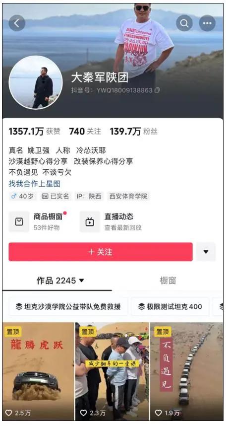 据悉,被告汽车博主姚 * 强的抖音账号为 " 大秦军陕团 ",约有 140 万粉丝。目前,在其账号上,前述与方程豹 " 豹 5" 相关的测试视频已下架。