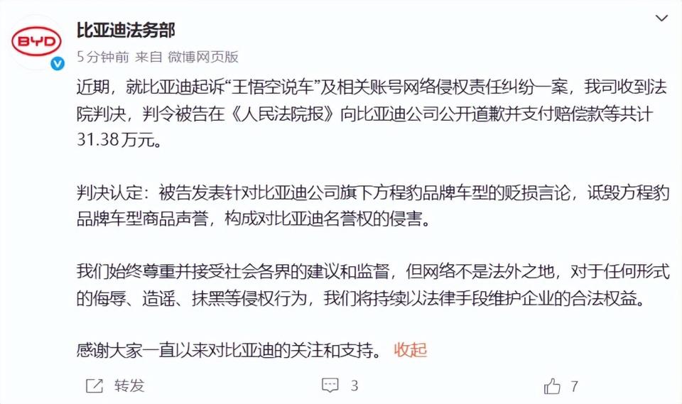 近期,就比亚迪起诉 " 王悟空说车 " 及相关账号网络侵权责任纠纷一案,我司收到法院判决,判令被告在《人民法院报》向比亚迪公司公开道歉并支付赔偿款等共计 31.38 万元。