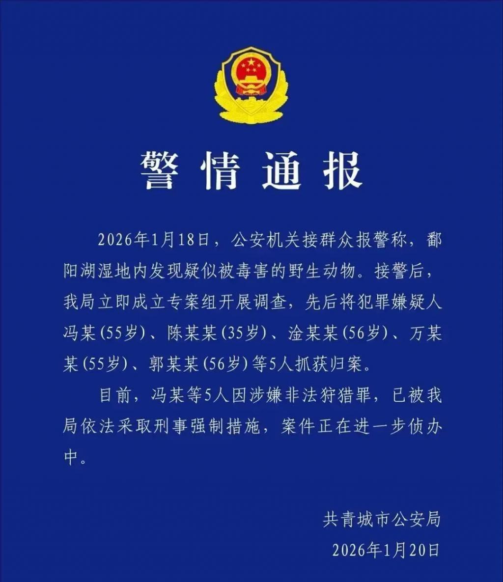 鄱阳湖水域广阔、入口众多,监控排查不易。然而,事件进展却出人意料地迅速。1 月 20 日晚,江西省共青城市警方发布通报:已查获 5 名犯罪嫌疑人,因涉嫌非法狩猎罪被依法采取刑事强制措施。