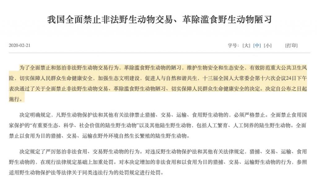 2020 年,我国全面禁止食用野生动物