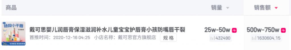蓝鲸新闻通过第三方平台查询发现,近 30 天内戴可思抖音平台品牌销售额在 2000 万到 5000 万元间,其中销售额最高的单品为戴可思婴儿润唇膏,近 30 天内销售额为 500 万到 750 万元间。