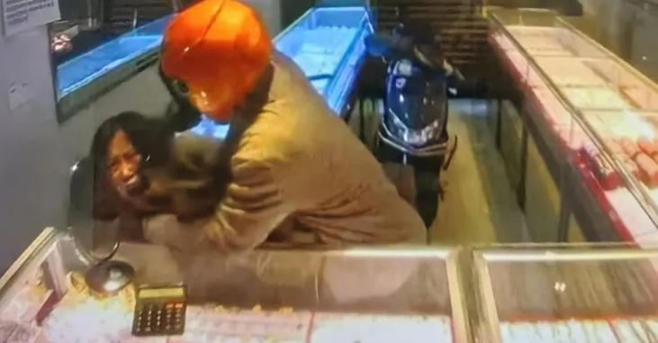 据悉,事发时间为 18 日。监控画面显示,店面卷帘门正在关闭时,戴头盔的嫌疑人从门缝钻入,殴打、电击店主,砸坏货品柜取走财物。