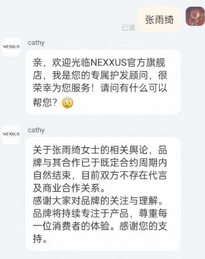 都市现场记者向 NEXXUS 官方旗舰发送张雨绮名字后,客服回复:关于张雨绮女士的相关舆论,品牌与其合作已于既定合约周期内自然结束,目前双方不存在代言及商业合作关系。