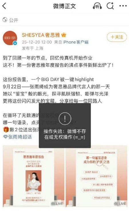 护肤美妆品牌 NEXXUS、奢思雅、玉容初、谷雨等删除所有代言内容,官博搜索显示 " 操作失败 " 或 " 无权查看 ";部分品牌声明 " 合作已于合约周期内自然结束 "。