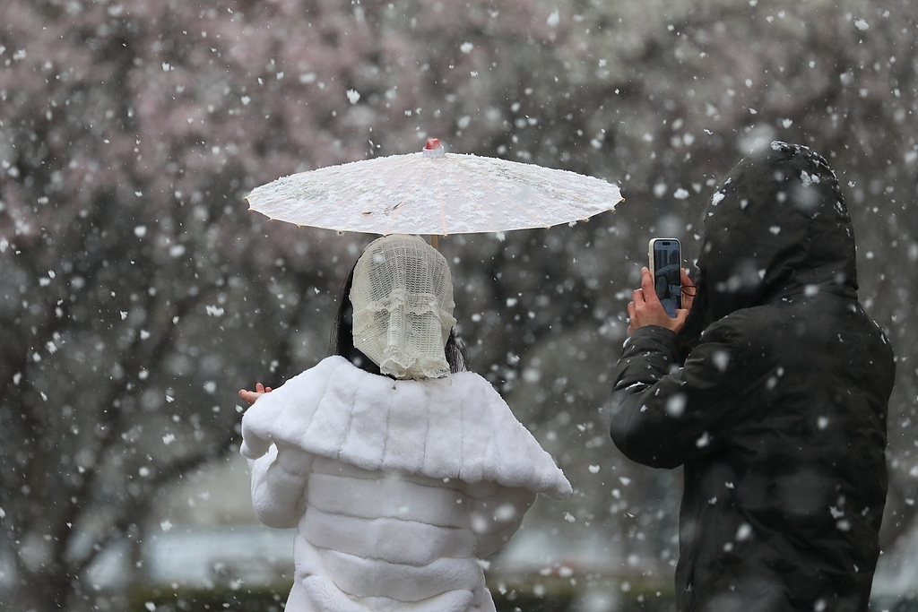 3月15日,北京城区迎降雪天气,市民雪天赏花。