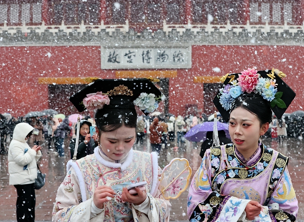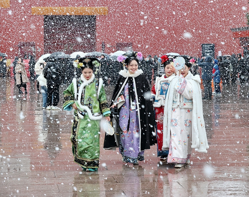 红墙金瓦覆新雪,虬枝宫梅暗香浮。“在逃格格”们手持团扇手机,踏着盈盈碎步,嬉笑着在故宫博物院前开启雪地Citywalk模式。雪片好似紫禁城的卸妆油,600岁素颜依旧能打。看着这般美景,春天来临的脚步好像多犯会节气拖延症也是极好的。
