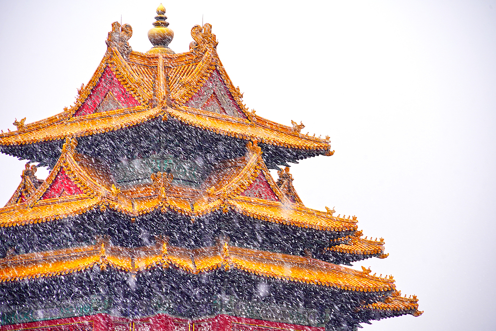 3月15日,北京城区较大范围出现降雪,鹅毛般的雪花与故宫角楼和神武门同框,白雪映红墙黄瓦,美不胜收,古典韵味愈发浓郁。