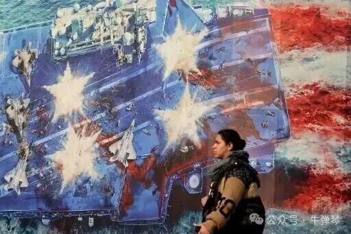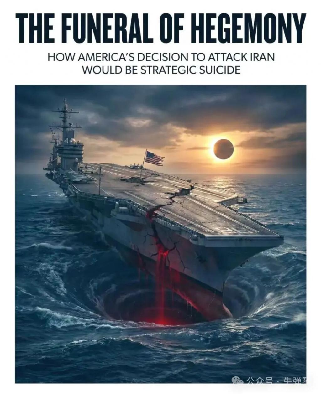 我看到,还有海报展示美国航母被摧毁的场景,文章的标题则是:" 霸权的葬礼,美国决定攻击伊朗将是一场战略自杀 "。