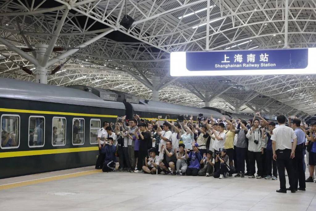 " 普速外迁,高铁入城 " 是全国铁路的一大趋势,但有的外迁却让坐绿皮火车的体验大打折扣。图为 2025 年 6 月 30 日晚,铁路迷在上海南站记录上海南至长沙的 Z247 次普速列车驶离。时值当年全国铁路第三季度调图,上海南站所有普速列车迁往 27 公里外的上海松江站。(图 / 视觉中国)