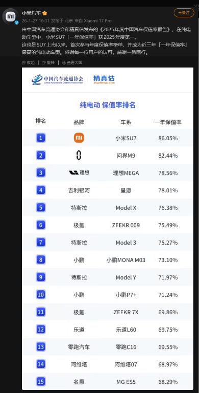 雷军对此拿出了中国汽车流通协会和精真估联合发布的 "2025 年度中国汽车保值报告 ",并解释道:" 小米 SU7 的 2025 年度纯电车型一年保值率是 86.05%,(保值率)排名第一位,是保值率最强的电动汽车。所以我也不太理解那么多二手车商突然冒出来,欢迎大家在看到时帮我们举报一下。并且现在网上也有很多记者实地去二手车行采访,小米 SU7 在各家的流动速度、保值率方面都表现很出色。而且在过去几年里,小米 SU7 在各家的保值率都排在第一位,例如保时捷 Taycan 当时是 80.66%,特斯拉 Model S 是 81.72%,而小米 SU7 是以 86% 的保值率获得了第一名。"