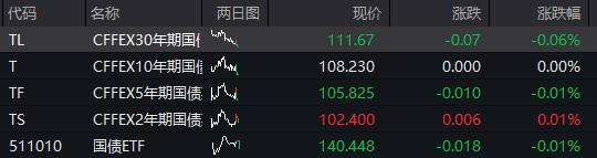 债市:国债期货全线下跌,截至发稿,30 年期主力合约跌 0.06%,10 年期主力合约持平,5 年期主力合约跌 0.01%,2 年期主力合约涨 0.01%。