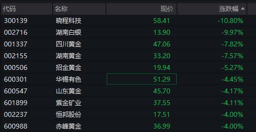 贵金属板块盘中大面积调整,湖南白银封跌停,晓程科技跌超 10%,白银有色触及跌停,四川黄金、湖南黄金、豫光金铅、招金黄金等跌幅靠前。