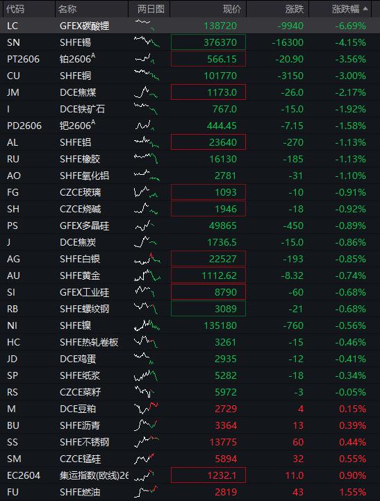 商品:国内商品期货普涨,截至发稿,碳酸锂跌超 6%,沪锡跌 4%,铂金、沪铜跌 3%,焦煤跌超 2%,铁矿石、钯金、沪铝、橡胶、氧化铝跌超 1%。