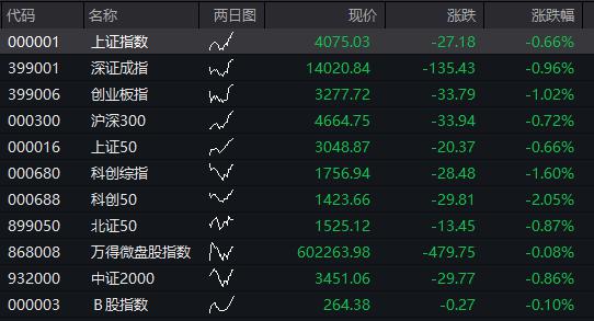 上证指数低开 0.66%,创业板指跌 1.02%。黄金、基本金属板块重拾跌势,光伏、算力硬件、半导体、AI 应用、金融科技概念股走弱;银行板块局部走强。