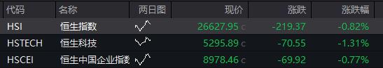 恒指低开 0.82%,恒生科技指数跌 1.31%。