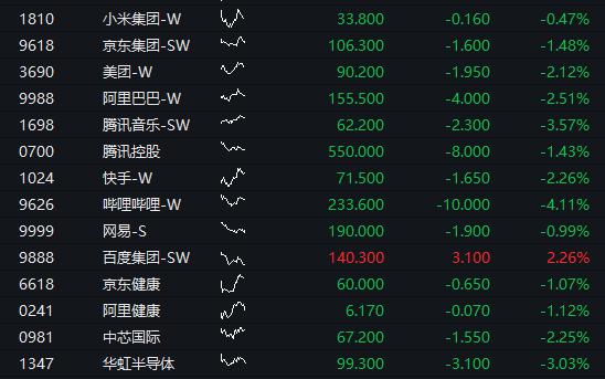 哔哩哔哩跌超 4%,腾讯音乐、华虹半导体跌超 3%,阿里巴巴、快手、中芯国际、美团等跌超 2%。百度涨超 2%,公司授权实施一项总金额不超过 50 亿美元的股票回购计划,预计于 2026 年宣布首次发放股息。