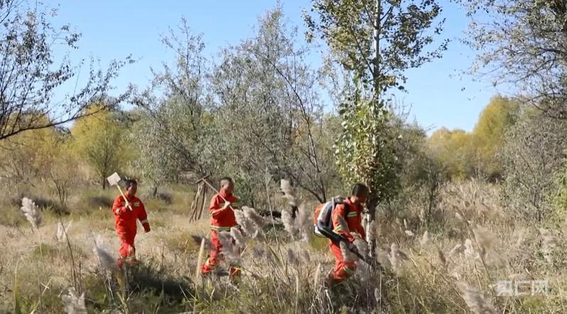 贾文义(中)与护林员们一起巡查锁边林(央广网发 杭锦旗融媒体中心供图)