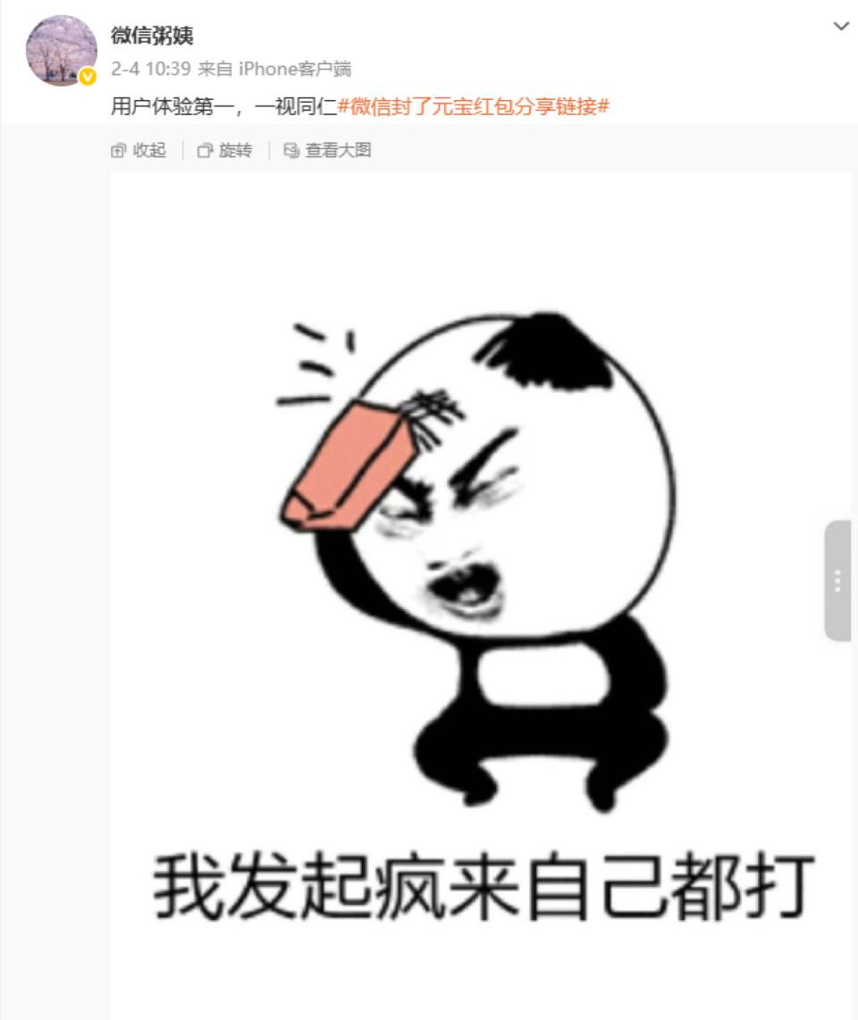 没错,腾讯旗下的微信封杀了腾讯旗下元宝。这波堪称 " 大水冲了龙王庙 " 的操作也是让众人看得目瞪口呆。2 月 4 日上午,微信公关总监 @微信粥姨 在微博发文对 " 腾讯元宝红包链接被微信屏蔽 " 作出了回应:用户体验第一,一视同仁。随后,元宝微博发文表示,元宝正在紧急优化调整分享机制,将尽快上线,确保用户抢红包体验。