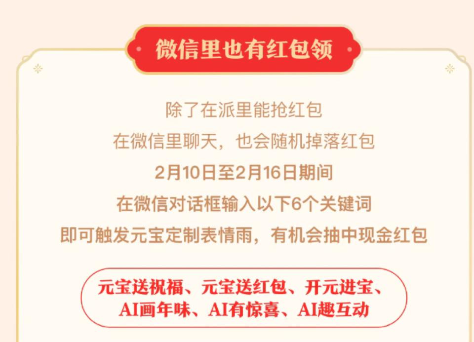 2 月 10 日,调整后的元宝发红包活动重新上线,此次调整元宝将更多的发红包的活动和功能集中在了元宝 APP 内完成,而在微信端改成了仅在聊天时输入关键词随机掉落。