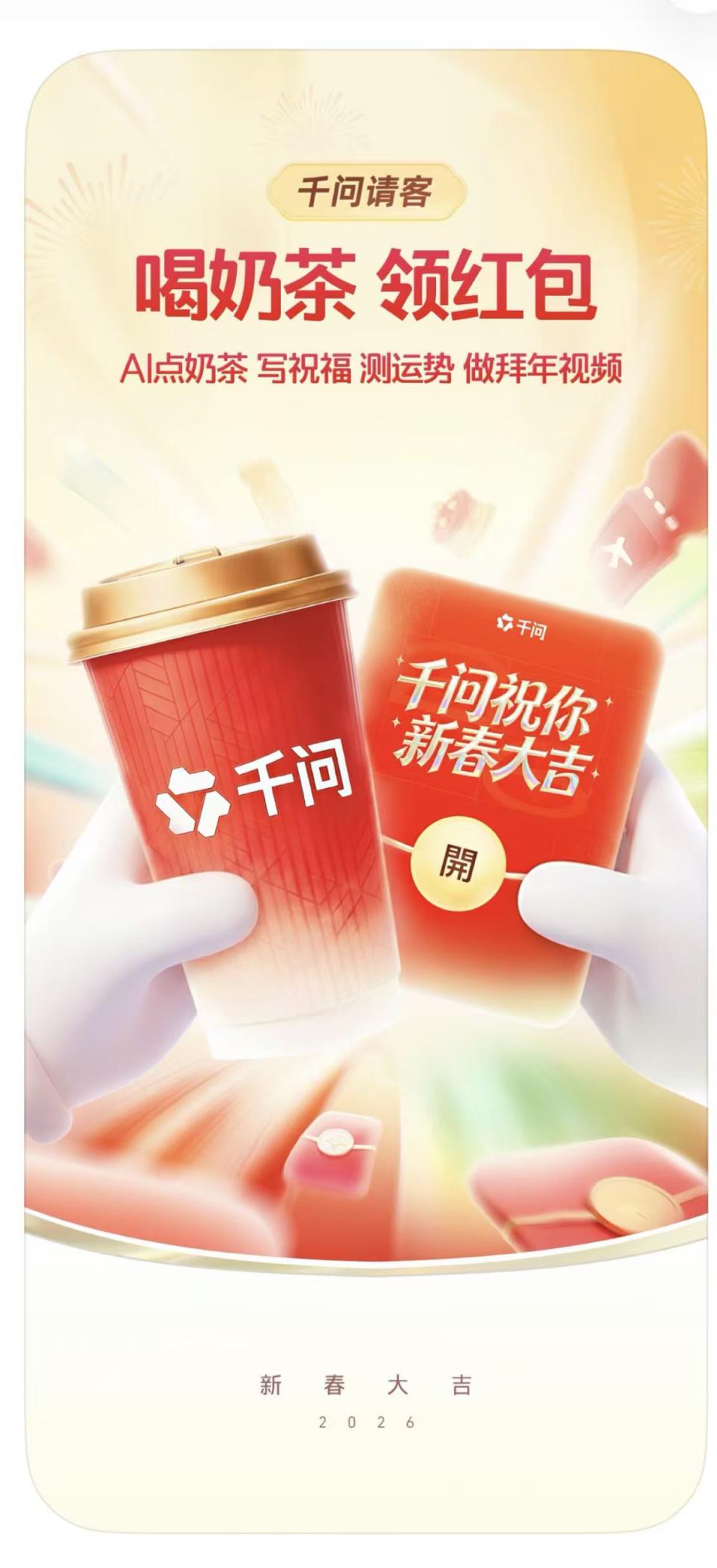 而此次阿里推进千问 APP,高度整合了旗下淘宝闪购、飞猪、高德地图等多个阿里生态平台,据悉,本次活动期间,千问向用户发放奶茶免单卡,邀请全国人民用 AI 一句话免费点奶茶,每个人可以领取 21 张无门槛的 25 元免单卡,相当于 525 块钱。千问 APP 活动页面显示,第一波免单活动时间为 2 月 6 日 -2 月 12 日,不仅能免单喝奶茶,也能通过淘宝闪购买年货、点外卖。此外,每邀请一名新朋友下载千问 APP,双方可各得一张 25 元免单卡。