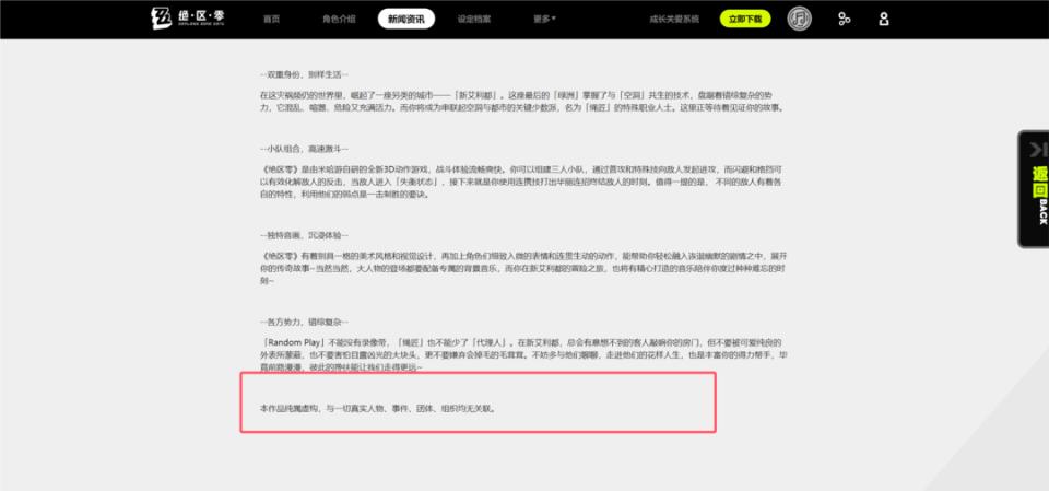 2022 年《绝区零》官网产品介绍中声明作品纯属虚构