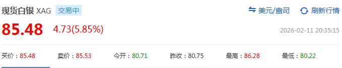 11 日晚,国际贵金属再度全线爆发。现货黄金站上 5100 美元 / 盎司关口,为 1 月 30 日以来首次,日内涨 1.56%。现货白银日内暴涨一度超 6%,报 85.85 美元 / 盎司。截至 20 时 40 分,涨幅均有所回落。