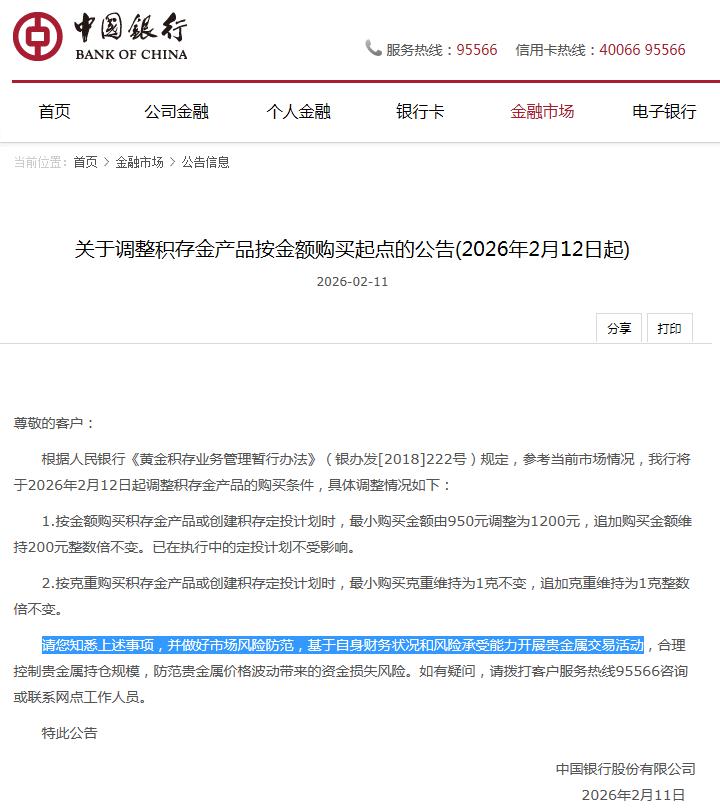 此外,中国银行 11 日发布关于调整积存金产品按金额购买起点的公告。中国银行将于 2026 年 2 月 12 日起调整积存金产品的购买条件。按金额购买积存金产品或创建积存定投计划时,最小购买金额由 950 元调整为 1200 元,追加购买金额维持 200 元整数倍不变。已在执行中的定投计划不受影响。按克重购买积存金产品或创建积存定投计划时,最小购买克重维持为 1 克不变,追加克重维持为 1 克整数倍不变。