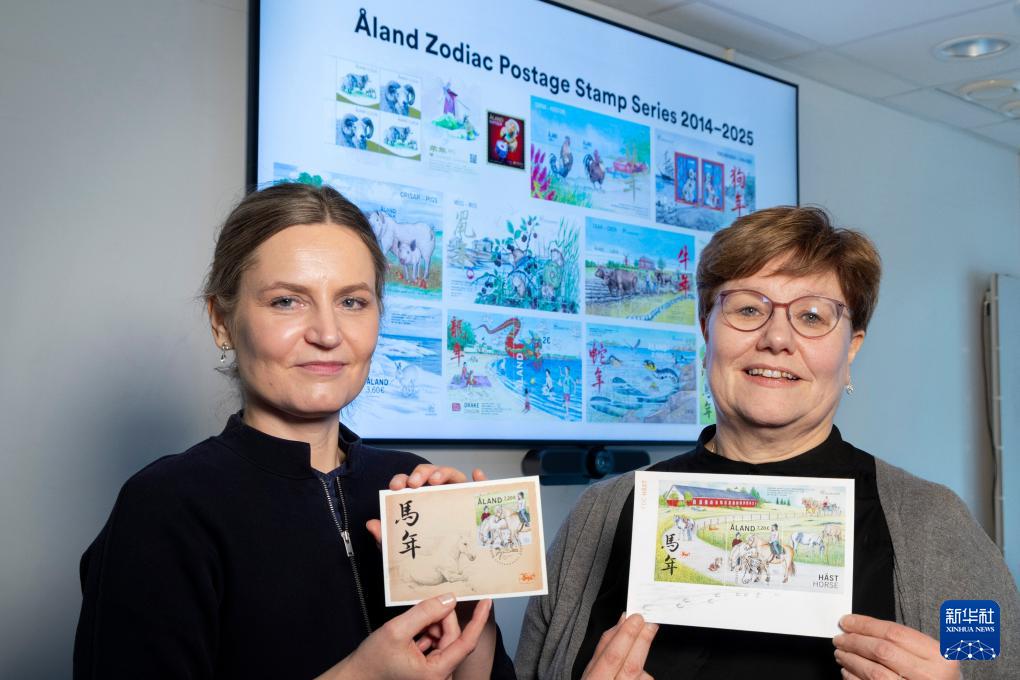 1 月 21 日,在位于芬兰奥兰群岛自治区首府玛丽港市的奥兰群岛邮政署总部,工作人员展示马年生肖主题邮票及邮政产品。新华社发(马蒂 · 马蒂凯宁摄)