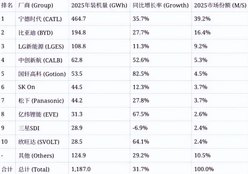 2025 年,全球动力电池装机量前十名中,中国企业占据 6 席,市场总占有率超过 70%,处于绝对的统治地位。
